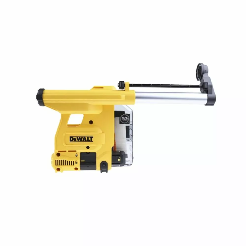 Højtydende støvudsugning med grossdimensioniertem beholdere til batteri-kombihammer DCH333NT. Drev via separat motor – effekt på kombi hammers påvirkes ikke. Kraftig HEPA-filter reducerer udslip af støvpartikler på et minimum. Enkel, værktøjsfri og hurtig fastgørelse af staubabasaugung på maskinen. Opsamling af bore mel og støv direkte i borehullet. Kompakt og let design. Ideel til arbejde over hovedhøjde samt til arbejde i støv følsomme rum.